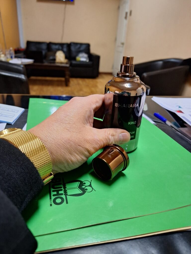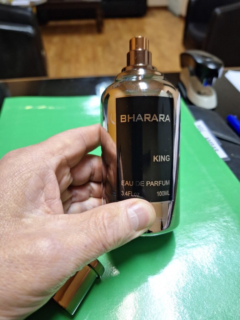 King de Bharara es una fragancia de la familia olfativa Aromática para Hombres. Las Notas de Salida son naranja, bergamota y limón; la Nota de Corazón es notas afrutadas; las Notas de Fondo son vainilla, almizcle blanco y ámbar.