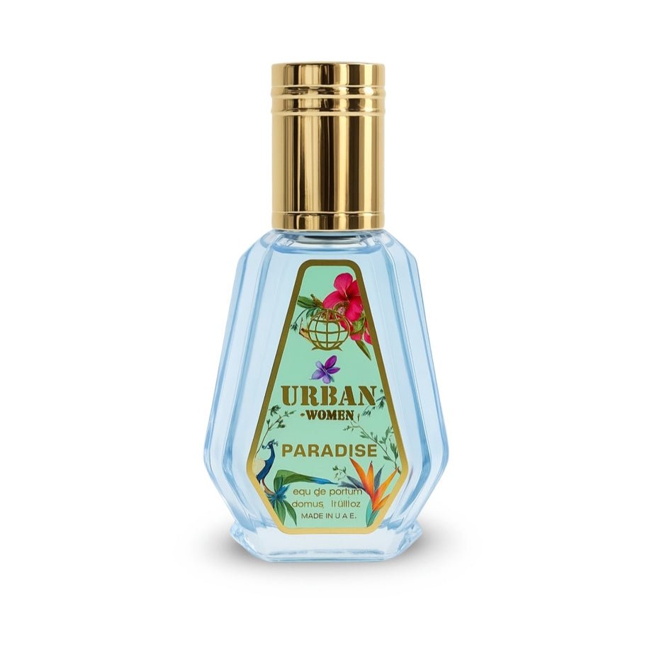 Urban Women Paradise de Fragrance World es una fragancia oriental floral, lanzada en 2024, que huele a una mezcla exótica y dulce de agua de coco, jazmín, iris, vainilla, sándalo y ámbar. Es descrita como fresca, cremosa y veraniega. Notas de Salida: Agua de coco. Notas de Corazón: Jazmín e Iris (floral seductor). Notas de Fondo: Vainilla cremosa, sándalo y ámbar